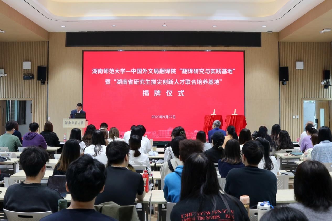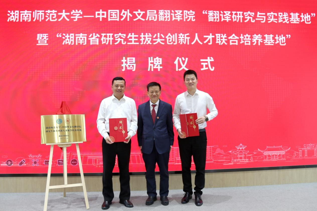 (记者 马铁泉 黄依依)9月27日上午,我校与中国外文局翻译院共建的“翻译研究与实践基地”暨“湖南省研究生拔尖创新人才联合培养基地”揭牌仪式在我校腾龙楼613会议厅进行,校党委书记蒋洪新出席仪式,仪式由副校长蒋新苗主持。