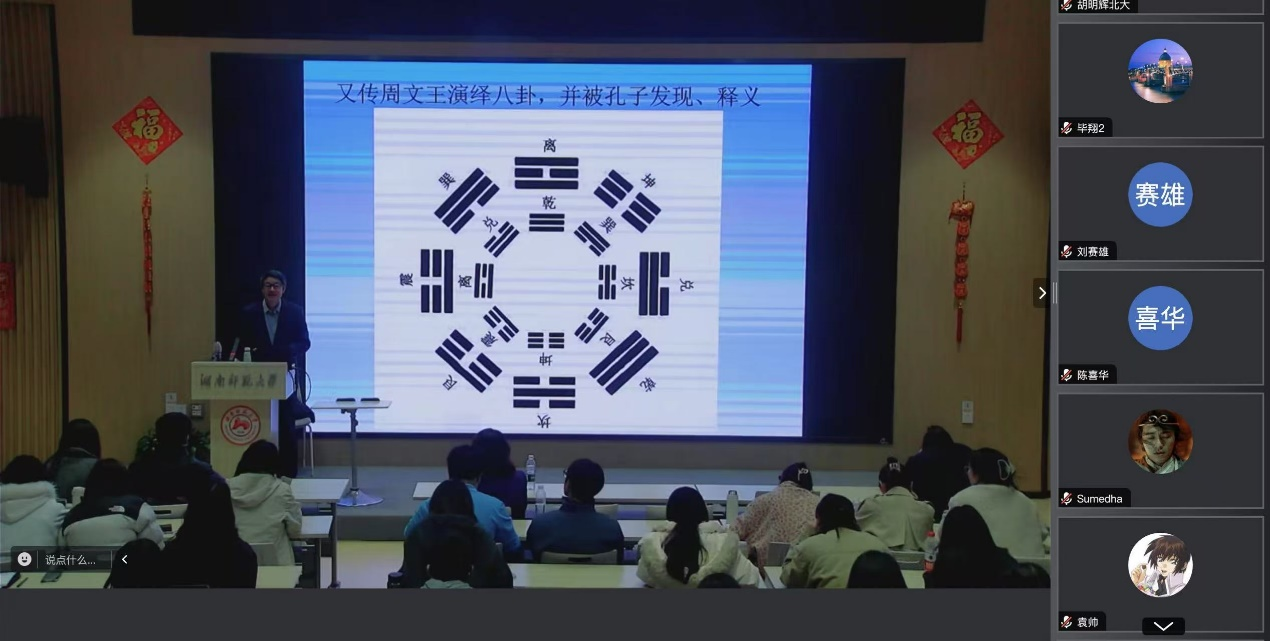 (通讯员 文逸闻)2025年3月31日晚19:00,由永利集团3044欢迎光临教育部文学文化课程虚拟教研室策划的“中外人文经典‘悦’读”系列教研活动第七讲成功举办。永利集团3044欢迎光临“潇湘学者”特聘教授陈众议受邀担任主讲嘉宾,以“作为人文经典的《易经》和中国式现代化”为题,深入解读《易经》的当代价值及其对中国式现代化的启示。讲座由永利集团3044欢迎光临副院长刘白教授主持,永利集团3044欢迎光临院长曾艳钰教授及百余名师生现场参与。活动通过线上线下同步进行,反响热烈。