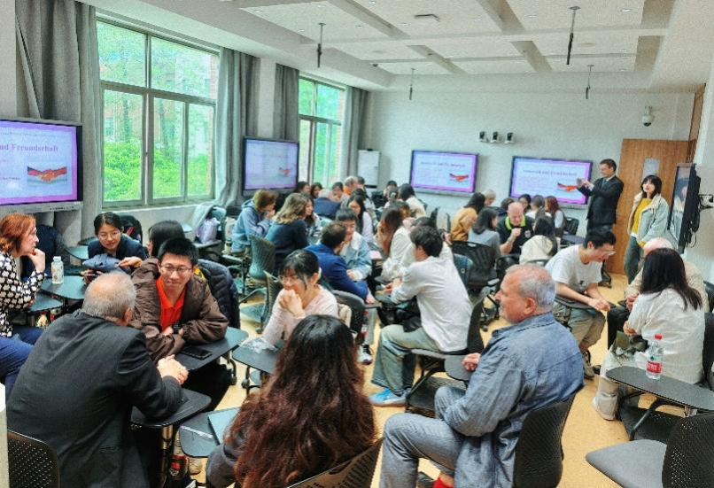 在自由交流环节,各班同学分组与德国友人们展开对话,双方围绕中德文化、社会以及生活中的多个话题进行探讨,从文化差异与共性出发,分享了个人经历与观察。讨论氛围轻松活跃,大家通过坦诚交流增进了对彼此生活方式和思维模式的理解,双方都收获颇丰。自由讨论结束后,德国代表团成员总结了交流成果,德语专业学生分享了活动感悟,现场气氛温馨热烈。