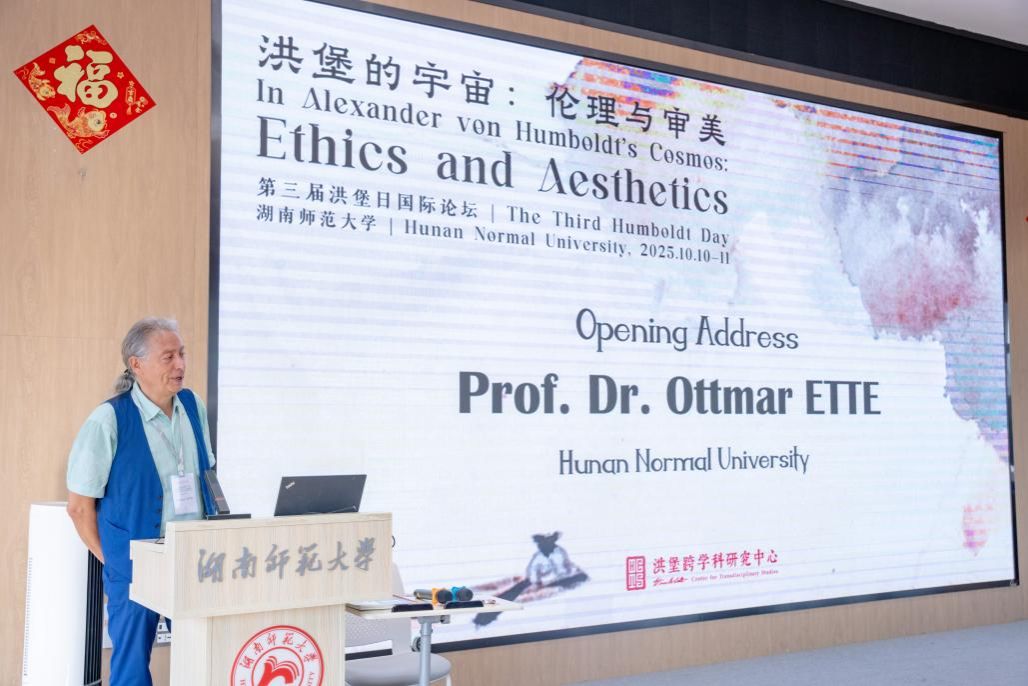 我校洪堡跨学科中心主任、“潇湘学者”特聘教授、柏林-勃兰登堡科学院院士Ottmar Ette教授首先感谢了永利集团3044欢迎光临和中心同事的辛勤付出。他指出,洪堡学界目前致力于建立由若干洪堡研究中心组成的洪堡研究全球网络,这些中心分布于德国柏林、古巴哈瓦那、中国长沙,以及哈萨克斯坦的新建中心。与此同时,越来越多的中国学者参与洪堡研究。他还表示,2026年第四届洪堡日活动将在重庆举办,届时欢迎大家与会。