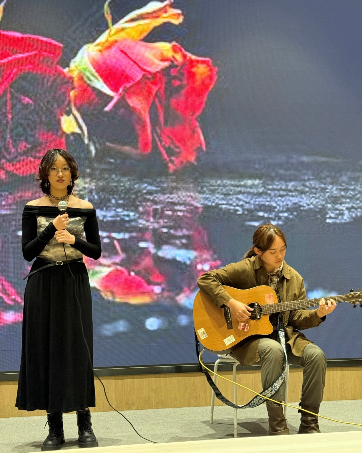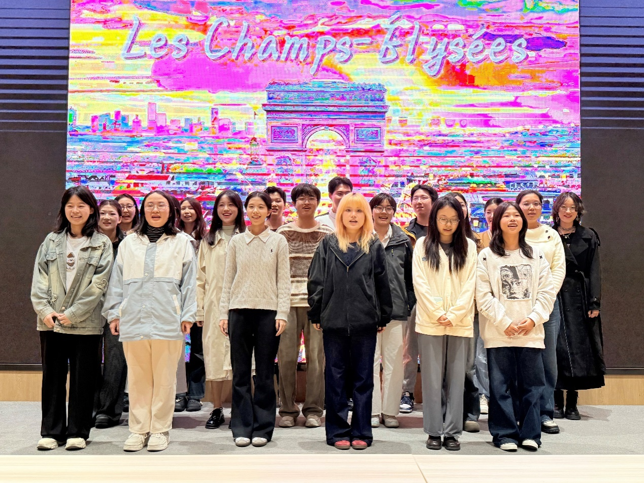 分享环节后,同学们献上了悉心筹备的演出,充分呈现了学子们的多才多艺,更真切流露了法语系大家庭的团结氛围,为新学期的崭新征程增添了朝气与憧憬。2024级本科生合唱的法语歌曲《法国十三天》(13 jours en France)娓娓动人、令人陶醉。2023级本科生带来的歌曲《我就是我》(Je suis moi)充满活力又饱含深情。2022级本科生在轻快美好的气氛中贡献了《香榭丽谢》(Les Champs-Elysées)的演唱。2022级本科生刘佳乐、2023级本科生刘诗语带来的吉他弹唱《爱与我》(L’amour et Moi),2025级研究生送上的法语配音节目《小王子》(Le petit prince),赢得了在场观众的热烈掌声。