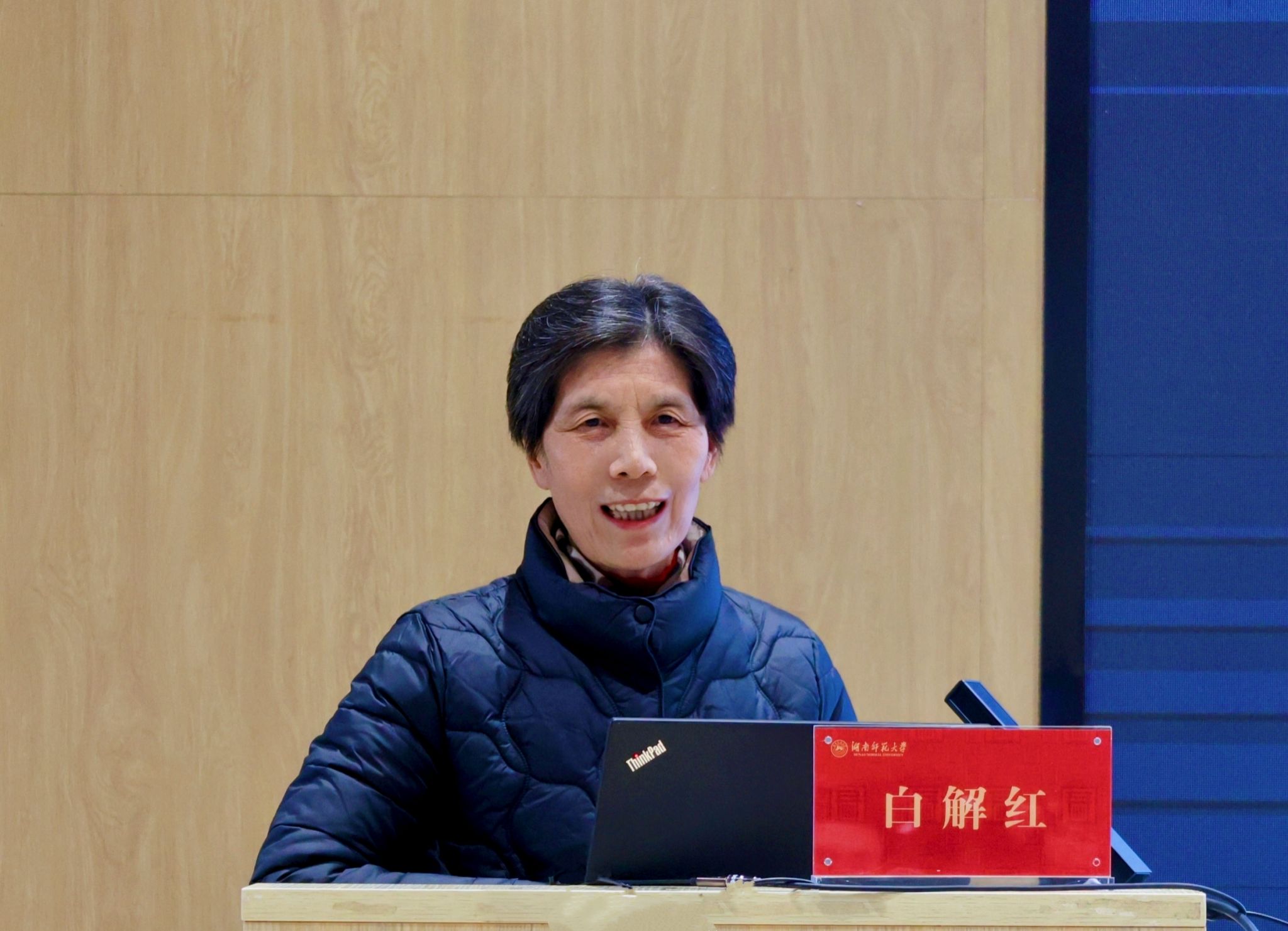 讲座伊始,白解红从古代教育思想与当今时代要求出发,深刻阐释了“人师”的丰富内涵,教育学生不应只做传授知识的“经师”,更应做“德”“行”“才”都能做表率的“人师”。随后,她围绕三大板块进行生动分享:谈到“心中有榜样”,白解红以自身成长中的鲜活故事为例,讲述了师长们言传身教的故事,鼓励学生善于发现身边的榜样,从中汲取前行的力量;在阐释“学做人师”时,她深情回顾学院从初创到跻身“双一流”学科的发展历程,勉励学生接续学院优良的治学传统与育人精神,坚守从教初心;围绕“师生共成长”,她强调教育是师生相互成就、共同前行的旅程,教学相长方能真正践行育人使命。白解红以“德、行、才”三位一体的做人准则作结,鼓励学生秉持雷锋的螺丝钉精神,兼具爱国本领与智慧,在教育岗位上践行立德树人使命,为中华民族伟大复兴贡献力量。