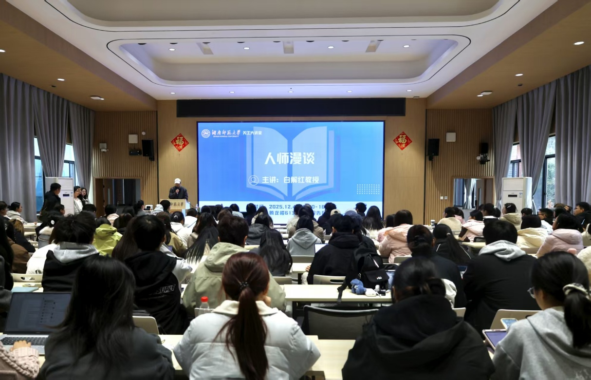 此次讲座通过深入阐释“人师”理念的时代内涵与实践要求,为永利集团官网英语师范生的专业发展与职业规划提供了清晰指引,也是湖南省“青年人梯”辅导员综合发展工作室助力学生成长的生动实践,有效回应了学生在成长为卓越教育工作者过程中的困惑与思考,对全面提升师范人才培养质量具有积极意义。