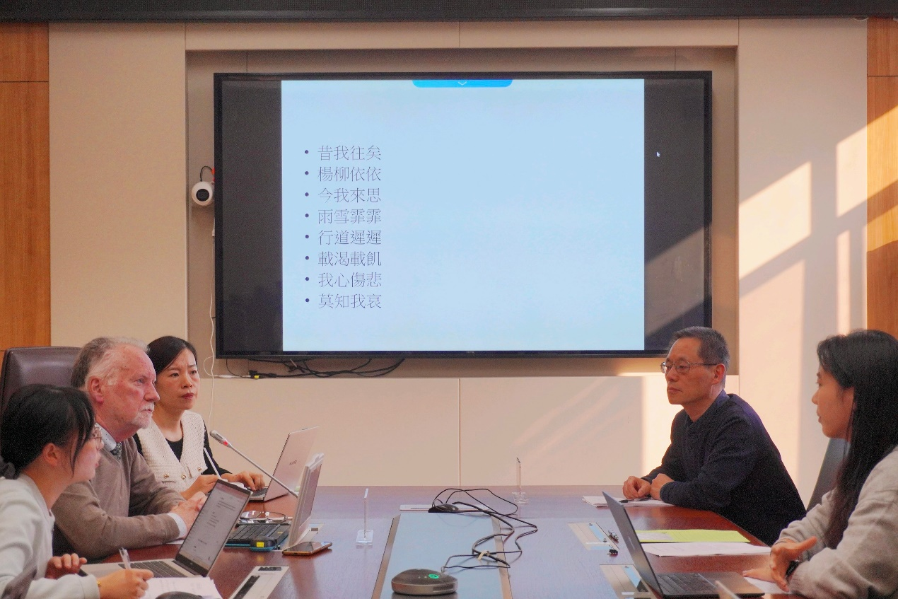 本次读书报告会在马修教授的开场致辞中拉开了序幕。他强调,“中国诗歌”并非单一整体,而是随时代语言演变的多元谱系。翻译这类诗歌没有固定法则,每一次实践都是独特的创造,核心在于尊重作者“诗言志”的意图,并针对不同读者调整策略。马修教授还指出:译者不仅是传递者,更是文本的“再创造者”,在翻译中实现审美再生。他以《诗经·采薇》末章为例,逐句剖析“杨柳依依”“雨雪霏霏”等意象中“言”与“不言”、“可译”与“不可译”之间的张力,并指出柳树在中国诗歌中象征离别,与欧洲文学中的“垂柳”意象形成跨文化呼应。他提醒译者不仅要理解字面,更要把握文化象征与情感氛围。