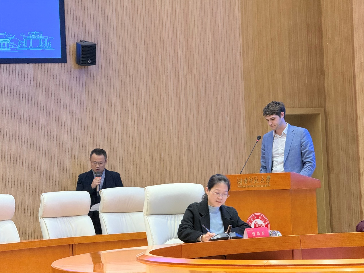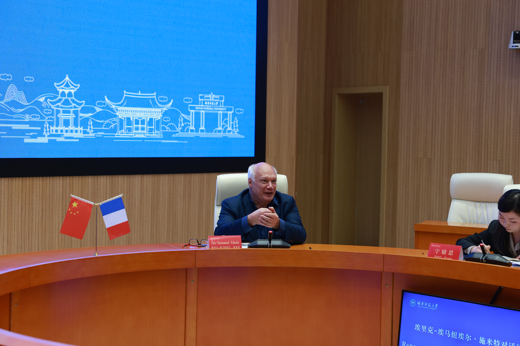 法国驻武汉总领事馆文化专员裴诺(Thomas Penot)先生在致辞中强调了法语作为文学与诗歌语言的力量,并对施米特先生的文学成就作了重点介绍。施米特先生不仅是法国当代文坛的杰出代表,也是龚古尔学院的正式成员。他的作品被广泛阅读和接受,并被翻译成多国语言在世界各国传播。他曾获法兰西学院戏剧大奖等众多文学奖项。裴诺先生特别提到,施米特先生的作品蕴含深厚的人文与灵性,其代表作《时间旅行者》系列前两部已在中国出版发行。