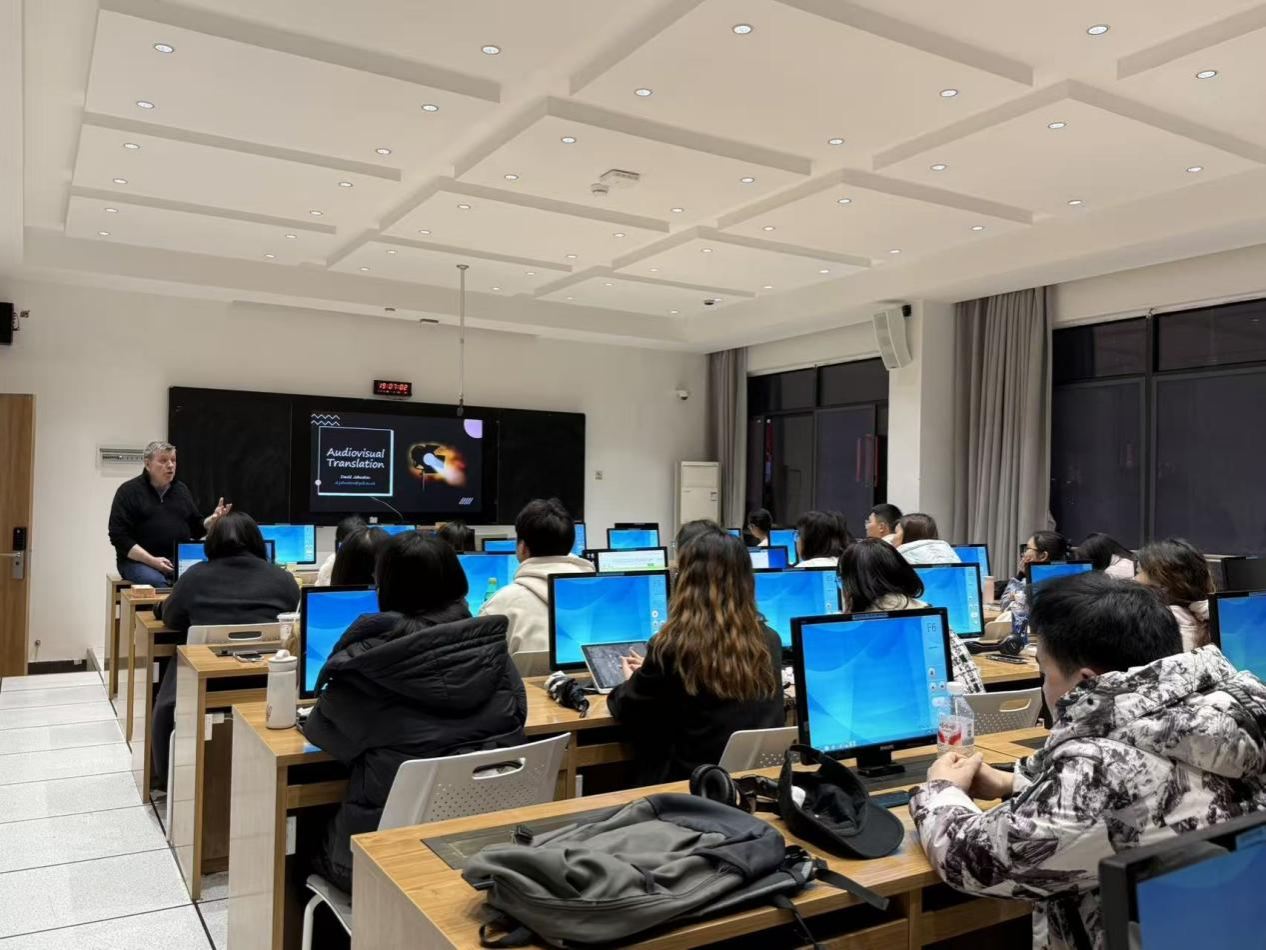 David Johnston教授主要研究翻译实践中,尤其是戏剧翻译过程中理论、实践及伦理之间的关系,研究成果颇丰,被《喜剧表演》期刊誉为“二十一世纪最具创新精神的西班牙黄金世纪戏剧翻译家”。课堂上,他首先介绍了翻译原则,强调译者创造性,告诫大家“翻译过程并非机械地转换信息,而是一项诠释活动”,“翻译不仅要涵盖原文明示内容,更要呈现原文隐藏信息和意义”。David Johnston教授深入浅出地将多模态视听翻译理论、实践技巧与行业发展前景融会贯通,娓娓道来。课堂学员围绕视听翻译核心原则、字幕与配音的应用、新时代如何应对AI冲击等关键问题展开讨论,现场气氛热烈。