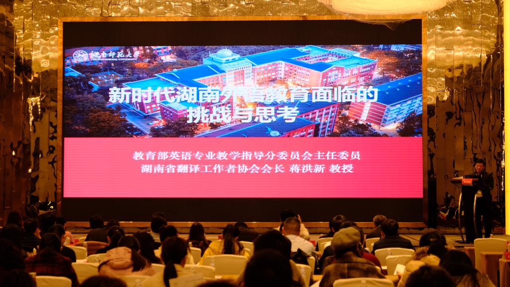 开幕式上,蒋洪新作了题为《新时代湖南外语教育面临的挑战与思考》的报告。他指出,新中国成立以来,湖南省外语教育取得了蓬勃发展,建立起规模较大、体系较完善的外语学科,整体发展水平与高校科研院所资源布局、社会经济发展情况基本相称,是全国外语教育大省。在构建人类命运共同体,推进“一带一路”倡议的今天,国家战略和湖南经济社会发展对外语教育的人才培养目标提出了全新需求,新兴科技变革对外语教育的内容与方式产生了直接影响,综合能力突出的学成归国留学生、非外语专业学生对外语人才就业市场形成了一定冲击,我省的外语教育机遇与挑战并存。他以我校外语人才培养改革为例,指出新时代湖南外语教育要主动对接国家战略和我省“一带一部”定位,突出“外语+外语”“外语+专业”的培养理念,培养高素质复合型人才;要紧跟“双一流”“新文科”的建设步伐,全面贯彻以学生为中心的教育理念,丰富外语教育建设内涵;要深化与现代信息技术融合,进一步创新教育形态、拓展教学资源、重构教学流程,为外语教育搭建起更为广阔的空间。
