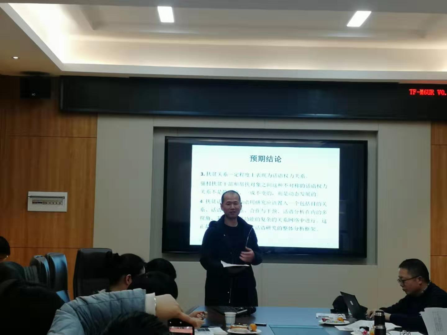 蒋意博士生的主讲题目为“中国驻村扶贫干部话语的认知语用研究”。该研究结合认知语用学的相关理论和原则探讨了中国驻村扶贫干部话语的模式、策略及功能。出席的专家老师对研究的选题给予了高度的肯定,同时也指出该研究需改进之处,从研究对象的描写、研究视角的选取、研究内容的逻辑连贯性及应用价值四个方面给出了具体的意见和建议。