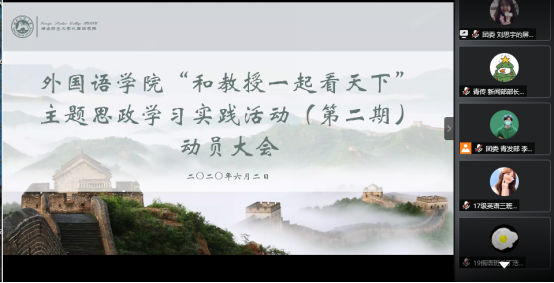 (通讯员 舒怡 夏秦萍 龚柯翰)6月2日,“聚焦‘两会’热点,争做‘一流’人才”为主题的第二期“和教授一起看天下”主题思政学习实践活动师生“云”动员大会在腾讯会议平台顺利举行。院长曾艳钰,党委书记唐建文、副书记贺慧星以及近40名教授学者参加教师动员大会;党委副书记贺慧星、学工办全体老师及院团委、青传成员、2016-2019级各支部委员参加学生动员大会。