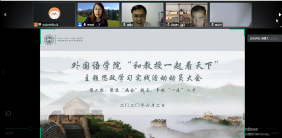 6月2日,学院院长曾艳钰、党委书记唐建文亲自组织召开了线上教师动员大会和学生动员大会,部署筹备工作。会上,曾艳钰院长表示,在“三全育人”背景下,学院积极推进专任教师参与思政育人工作,2019年举办的第一期“和教授一起看天下”主题思政学习实践活动取得了良好效果。以“两会”成功召开为契机,各位专家学者作为思政指导员要结合各对应班级具体情况,从疫情防控下人类命运共同体构建、后疫情时代中国大学生的责任与担当等方面展开深入思考与讨论,培养外语学院学生的国际视野、天下情怀,引导学生形成批判性、思辨性的思维,树立正确的人生观与价值观。