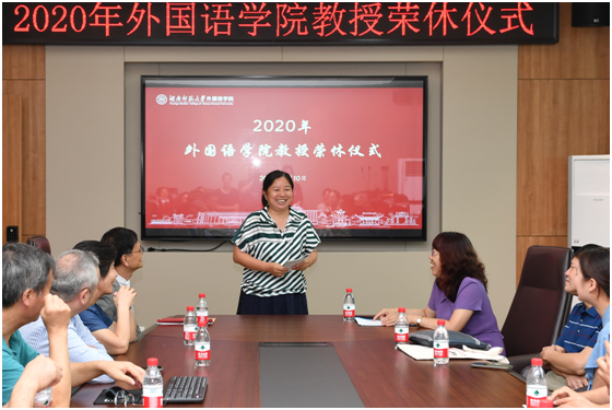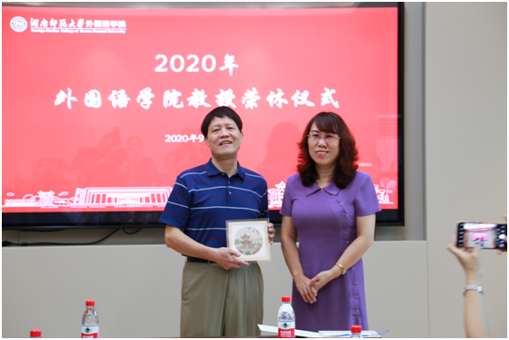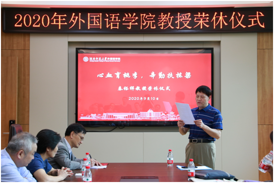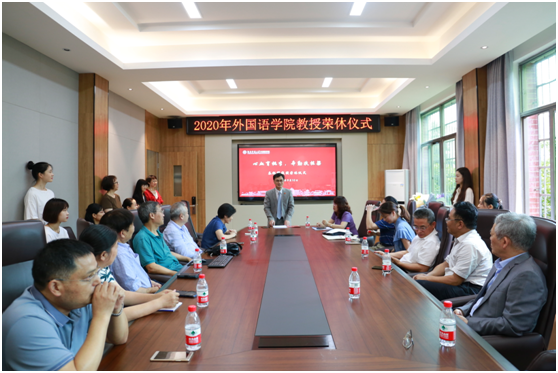 (通讯员 胡潇予 常红钰)9月10日下午,正值第36个教师节到来之际,学院在腾龙楼204会议室为英语系退休教师秦裕祥教授举行了荣休仪式,仪式由院党委书记唐建文主持,院长曾艳钰出席并致辞,出席仪式的还有副院长谭福民、廖光蓉、高荣国以及白解红、刘曙雄、阮炜、肖华峰等教授代表、其他教师代表、校友代表和学生代表等四十余人。