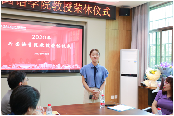 荣休仪式上,唐建文首先和参会人员共同回顾了秦老师从教42年的教学生涯,接着学生代表送上了美丽的鲜花,曾艳钰代表学院向秦老师赠送纪念品并送上了诚挚祝福。她表示,秦老师多年来在工作上敬业负责,无私奉献,为学院的发展做出了突出的贡献,赢得了全体师生的尊敬。教师代表邓云华教授和秦老师所指导过的学生代表2017届硕士研究生张英分别发言。她们深情回顾了和秦老师共事、教学、科研以及担任管理岗位负责人等的经历和动人的故事,感谢他在学习、工作以及生活上给予的无微不至的关心和帮助。最后,秦老师动情地表达荣休感言,他讲述了自己求学和从教经历,分享了学习、教学、科研、管理等方面工作心得和体会,向学院、领导、同事及学生们表达了由衷的感谢,他深情地祝福学院的各项事业在未来的岁月中蒸蒸日上、红红火火。