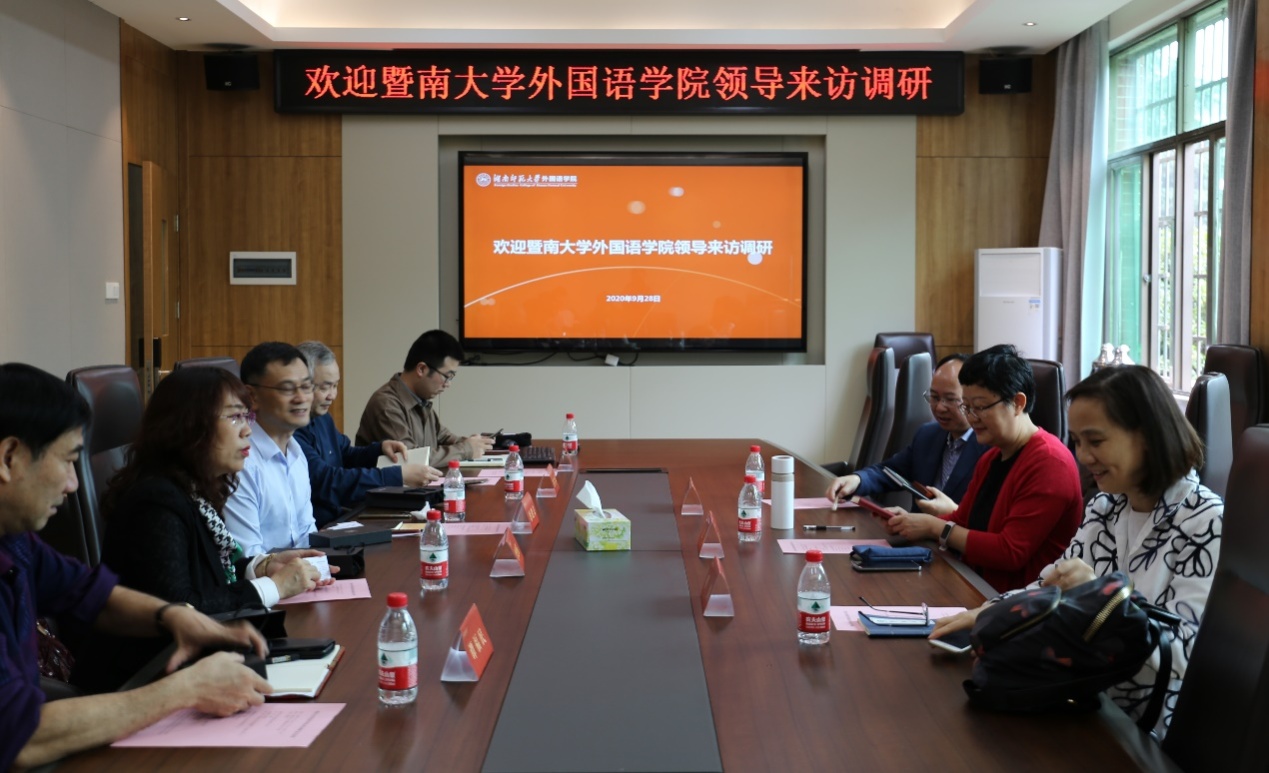 (通讯员 常红钰 夏秦萍)9月28日,暨南大学永利集团3044欢迎光临院长赵雯,副院长梁瑞清,英语语言文学系教授、专业建设带头人程倩一行来永利集团官网调研外国语言文学学科发展情况。调研座谈会在腾龙楼204会议室举行,副院长谭福民主持座谈会,院长曾艳钰、党委书记唐建文、副院长廖光蓉、科研办主任孔杰出席会谈。