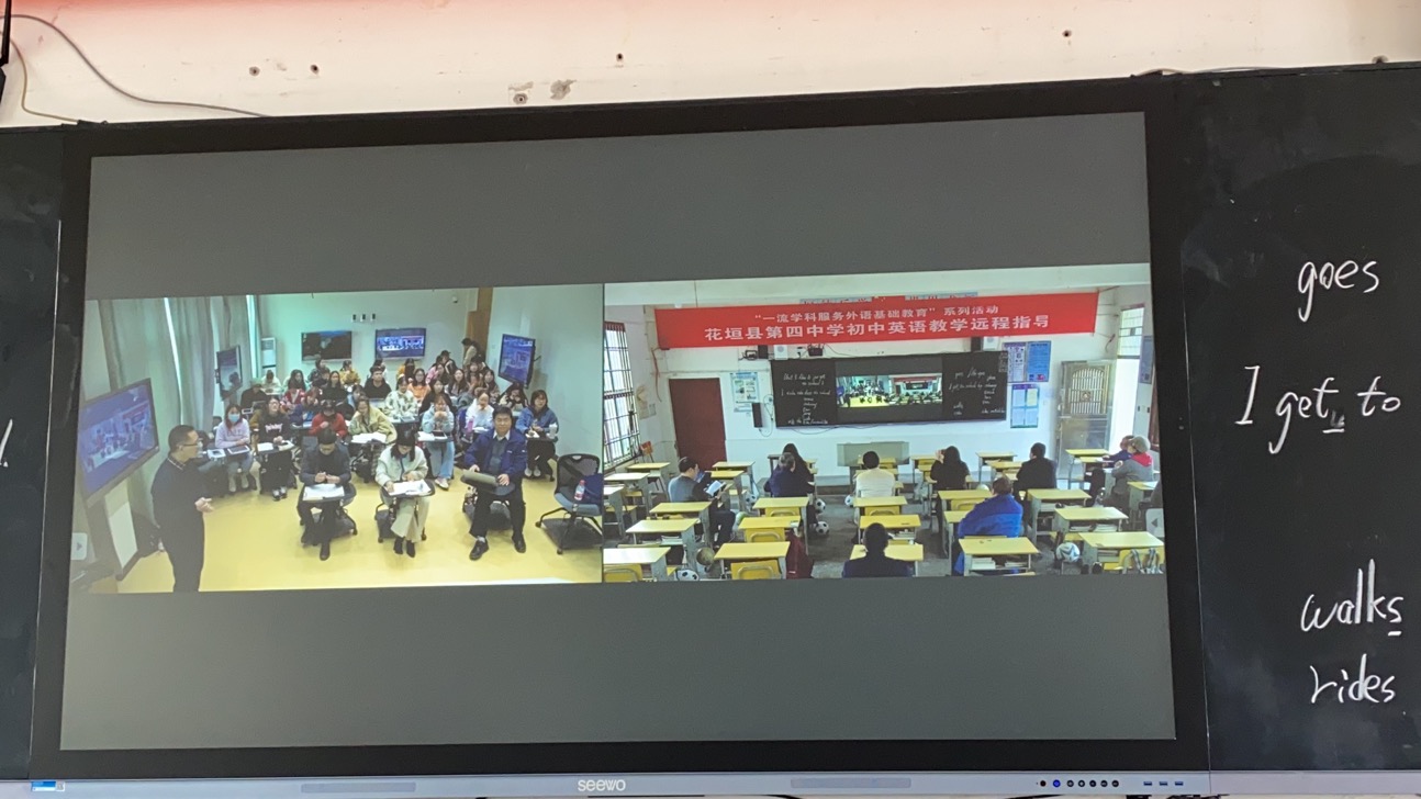 曾艳钰一行听取了初中七年级的一堂英语听说课。同时,通过远程互动教学平台联动,湖南师大永利集团3044欢迎光临2018级英语专业本科生、学科教育硕士生、永利集团3044欢迎光临“乡村外语教育实践基地”之资兴三中、芷江三中和花垣县边城高级中学、民族中学的英语教师都在当地同步观摩课堂教学。