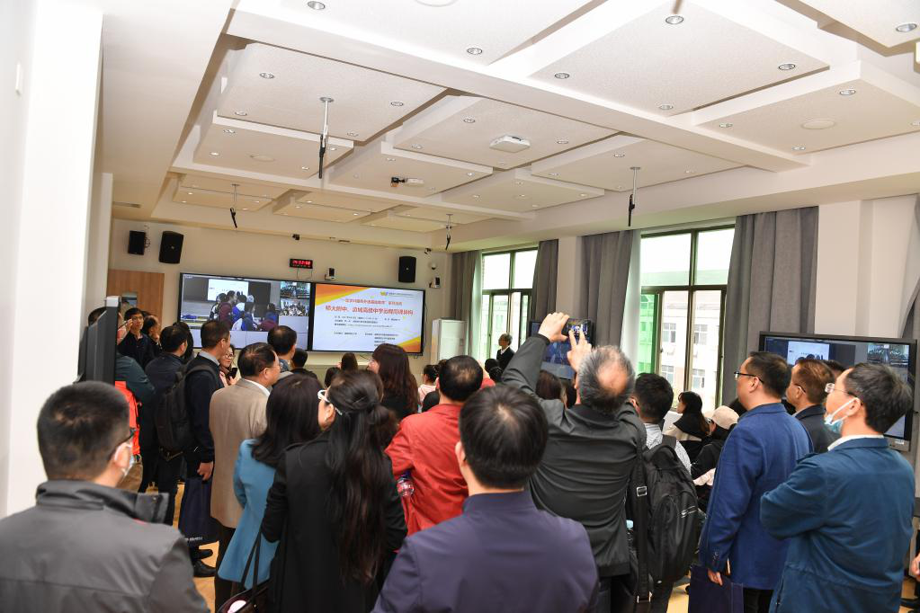 在学院智慧教室,湖南师大附中与边城高级中学通过远程进行同课异构,与会嘉宾观看了学院“一流学科服务外语基础教育”远程教研指导活动,了解永利集团3044欢迎光临“乡村外语教育实践基地”服务乡村教育振兴的情况。在虚拟仿真实验室,与会嘉宾观摩了国家级虚拟仿真实验教学一流课程“‘一带一路’背景下跨文化障碍语言交际虚拟仿真实验”的教学情况,体验了实验室VR设备的场景教学。