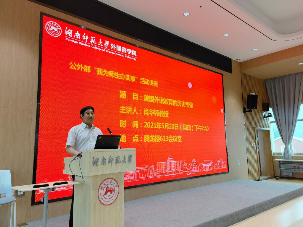 (通讯员 李亚文)5月20日下午,永利集团官网公外部在腾龙楼613报告厅举行“我为师生办实事”活动系列讲座。本次讲座邀请“潇湘学者”特聘教授肖华锋带来题为“美国外语教育的历史考察”的学术讲座。讲座由副院长谭福民教授主持。