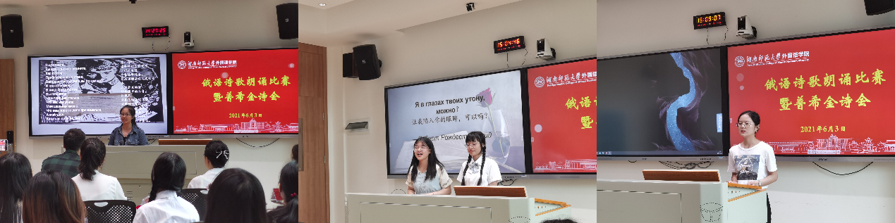 (通讯员 曾永兴)6月3日下午,俄语系在腾龙楼404教室举办俄语诗歌朗诵比赛暨普希金诗会。副院长兼俄语系主任高荣国出席活动,俄语系教师朱蝶、李政文、易鑫、曾永兴、李菁菁以及俄罗斯留学生爱德华担任本场比赛评委,俄语系以及音乐学院中外合作办学班的学生参加并聆听了本次比赛。