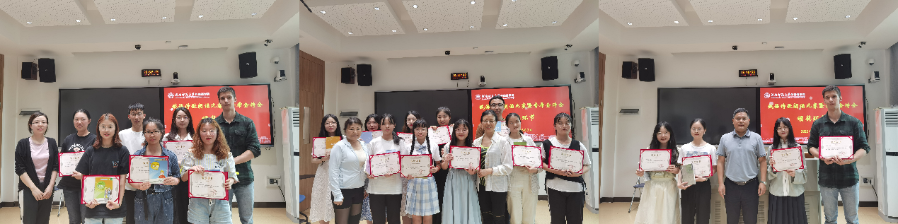经过激烈角逐,最终4名同学脱颖而出获得一等奖,4名同学获得二等奖,6名同学获得三等奖,其余6名同学荣获优胜奖。高荣国、朱蝶、李政文、易鑫分别对本次比赛进行了点评,勉励同学们在以后的学习中更加勤奋努力,多读俄罗斯文学经典作品,用心去感受俄罗斯诗歌之美,并为获奖选手颁发了荣誉证书和奖品。