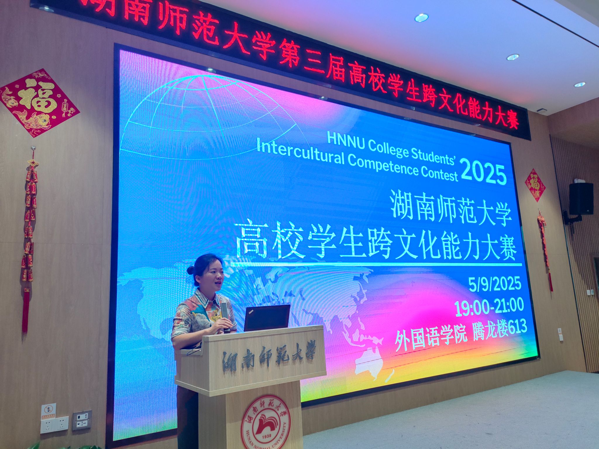 5月9日晚,永利集团3044欢迎光临第三届高校学生跨文化能力大赛校赛在永利集团3044欢迎光临腾龙楼613报告厅内精彩上演。永利集团3044欢迎光临副院长刘白教授亲临现场并发表致辞,公共英语部主任曾达之、副主任侯奇焜,以及李文佼、雷蓓、李澧等教师共同担任评委,全校师生纷纷前来观赛,共同见证这一文化交流的盛会。