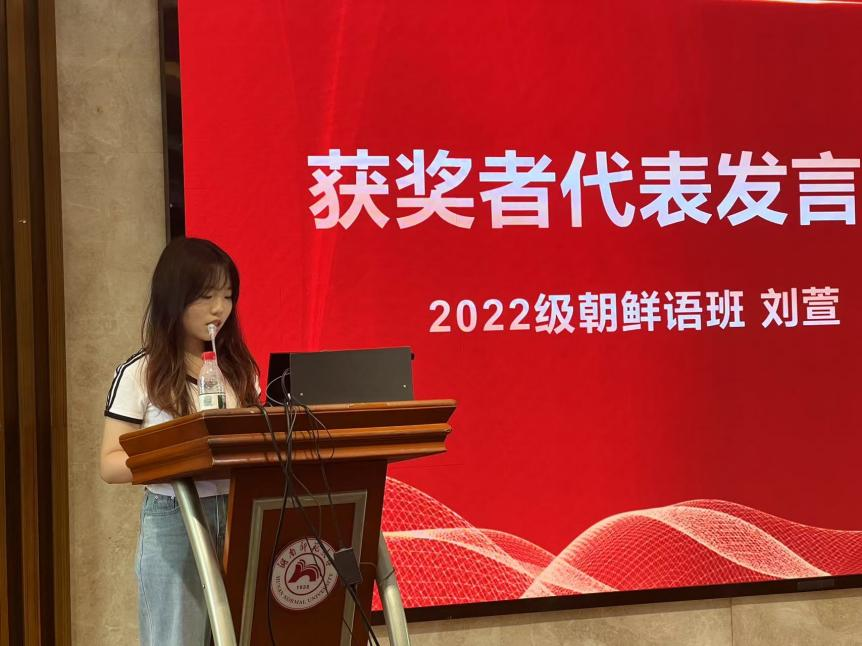 2022级刘萱作为获奖代表发言,分享了自己的追梦历程。她提到,这份荣誉不仅是老师们栽培的见证,更承载着对中韩文化交流的使命。未来将以更高标准深耕学术、投身实践,也期待与同窗共赴追梦之路,不负青春韶华。