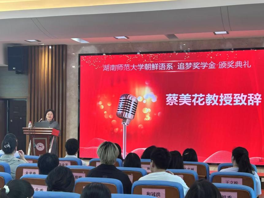 蔡美花教授在教授寄语环节向同学们阐述了“追梦奖学金”中“梦”的深刻含义,同时结合自身韩国学研究经验,勉励学生以‘追梦’为起点,以自己的方式不懈奋斗,成为国家的栋梁之才。