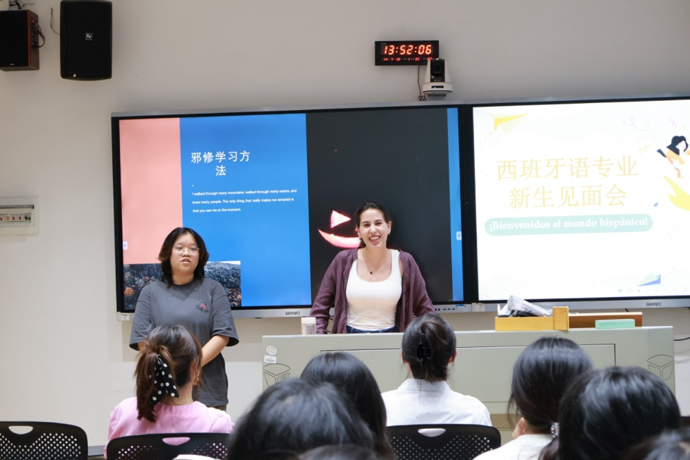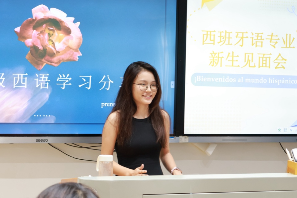外教María老师用自己的亲身经历为大家诠释了学习新语言、认识新文化的意义,她的分享由2022级学姐鲍宇欣Iris现场口译。她坦诚分享了自己在学习中文过程中的挑战,还特别强调了学习新语言的非凡意义:"语言不仅仅是工具,还是一把可以打开世界大门的钥匙。学会一门新的语言可以改变你的思维方式、感知方式、看待世界的方式。”基于自己的学习经验,她鼓励新同学们用西语交流,用西班牙语思维思考,把握每一次宝贵的练习机会。