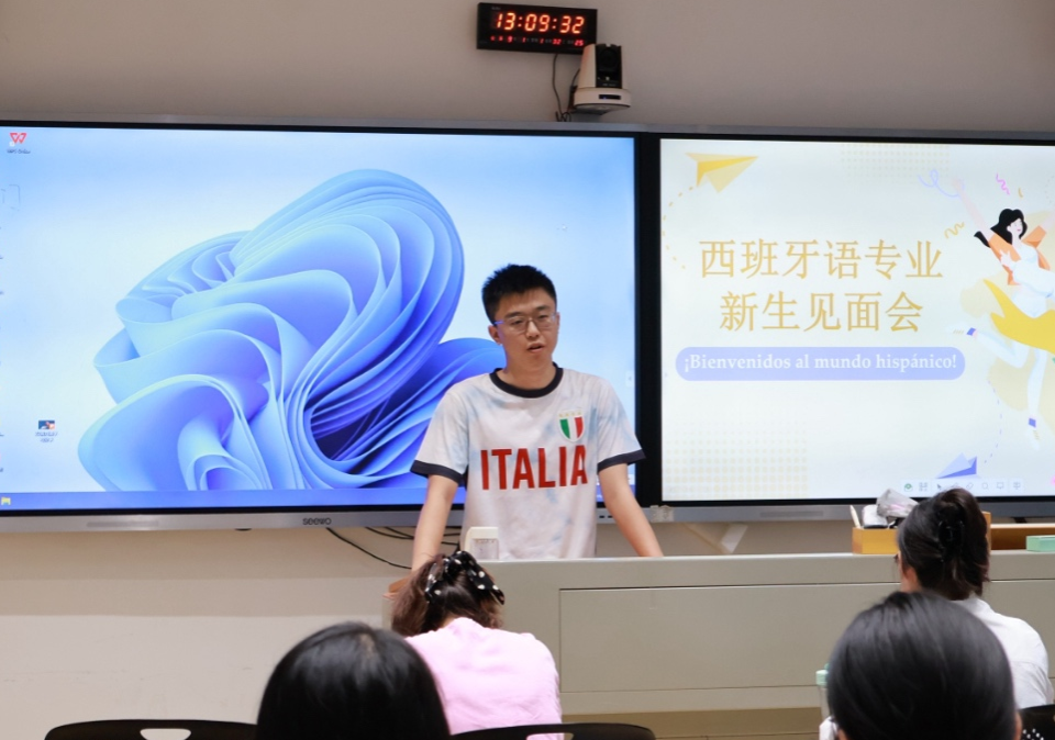 2023级学长王仕博Luciano首先开门见山地表达了对新同学们的欢迎。基于一年学习经历,他总结了西语学习的三个关键要点:首先,打下良好基本功至关重要——语法掌握、词汇积累、课文背诵缺一不可,必须跟紧课堂熟练掌握基础理论。其次,理论与实践必须并行,建议大家在第二学期有一定基础后,通过课内教材和课外学习资料的辅助进行大量的输入练习。第三,保持正确的学习心态亦是学习的关键,面对学习路上必然出现的瓶颈期和天赋差异,他的建议是保持平常心:"语言是习得性事物,天赋可以通过努力坚持去弥补。尽人事,听天命,只要认真投入,就能问心无愧。"