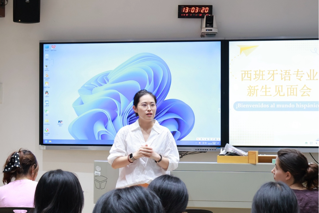 最后,西班牙语专业负责人邢鸿儒博士围绕“AI时代的语言学习的意义与价值”的话题与新生展开交流。我们究竟为什么要学习语言呢?邢鸿儒老师给出了深刻的答案:语言不仅是语言,更是文化的积淀,能够帮助我们打开视野,接触新的思维方式;语言不单单是工具,要逐渐将它内化为我们的视野和思维方式。西班牙语在世界范围内广泛使用,它不仅是看世界的工具,更是认识世界的能力。面对时代发展,我们要用积极乐观的心态拥抱AI、使用AI,但不能依赖它。AI在迭代,人也不能停止进步,这就要求我们提高现阶段教育对人才培养的起点,学习语言不单停留在语言本身,更要内化为我们的视野与能力。