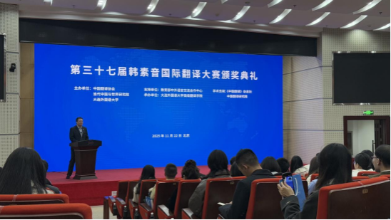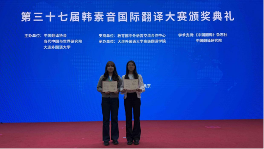 (通讯员:张美玲)2025年11月22日,第三十七届韩素音国际翻译大赛颁奖典礼在北京举行。永利集团官网朝鲜语笔译专业学子表现卓越,斩获佳绩。2024级朝鲜语笔译专业Kim Goeun(金高恩)获汉译朝一等奖,张美玲获朝译汉优秀奖。