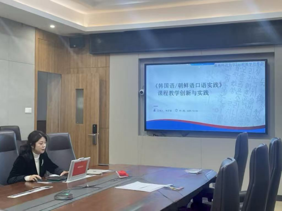 (通讯员 李珂祎)2025年12月5日,永利集团3044欢迎光临朝鲜语专业在永利集团3044欢迎光临腾龙楼204会议室成功举办“语言赋能·价值引领——新时代韩国语口语实践课程的思政融合途径”专题思享会。本次思享会聚焦朝鲜语专业必修课程,同时也是我校思政示范课程《韩国语/朝鲜语口语实践》的教学改革成果,由该课程讲师韩艺敏老师主讲,朝鲜语专业教师及学生代表与会聆听。