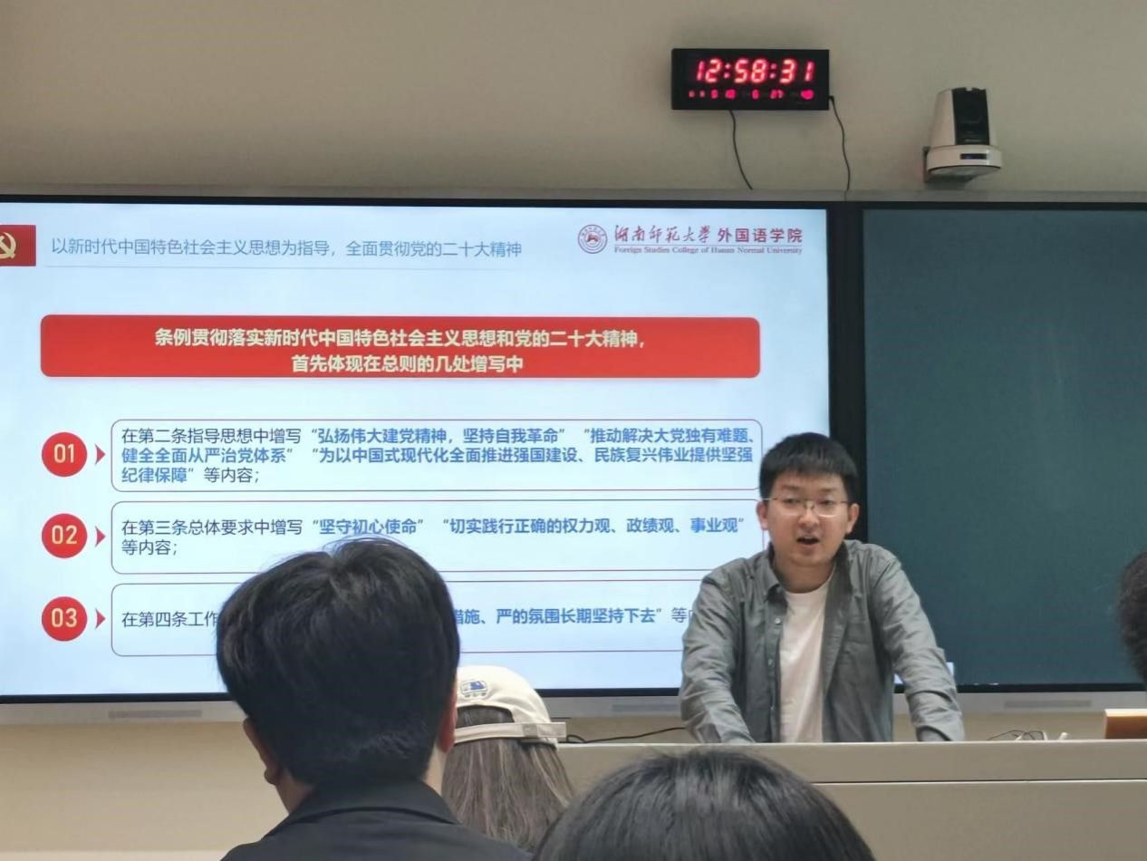 院团委书记、本科生第二党支部书记王耀光对近期支部开展党纪学习教育的相关安排进行讲解,以新修订的《中国共产党纪律处分条例》为主题,从《条例》修订的背景、新修订的《条例》有哪些突出特点、作为学生党员对此应有的领悟和思考等这三个方面讲授专题党课。他希望支部全体党员严格按照学院党委的安排部署,准确把握学习教育的目标要求,抓住学习重点,充分发挥带头作用,确保学习教育取得实效。
