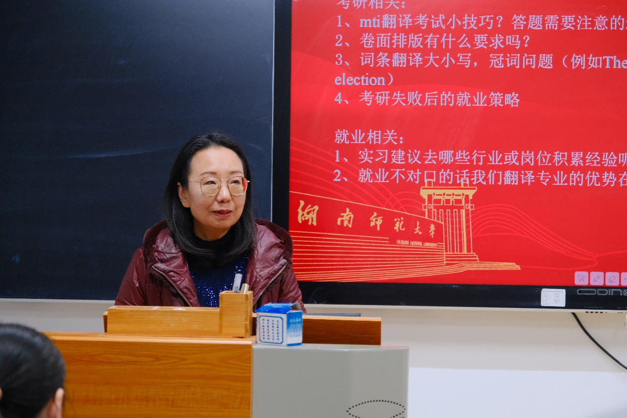 杨平从就业角度切入,结合国家现实需求和行业发展背景,分析了翻译专业学生的就业前景。杨平强调,目前国家对于高层次的翻译人才需求越来越迫切,学生们应该不断地提升自己的综合能力以适应社会变化和需求,同时,她提醒同学们要认清考研的形势,并为之做好充分的准备。