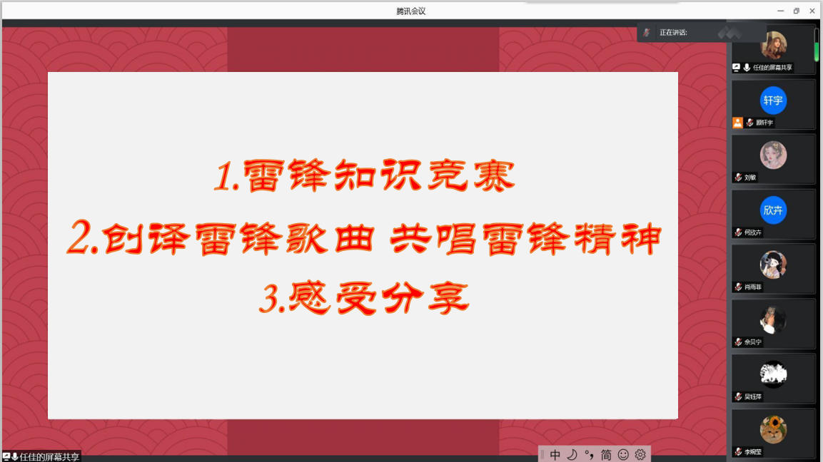 活动总共分为三个环节:雷锋知识竞赛、“创译雷锋歌曲,共唱雷锋精神”、感受分享。