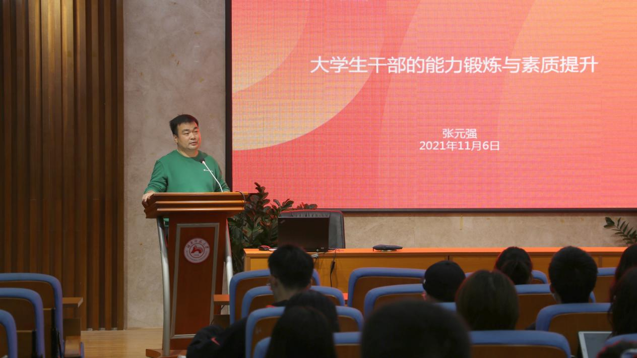张元强结合新生学生干部在工作中的现实表现、存在的困惑等方面,他向同学们就学生干部的基本能力提出三点要求:一是明确角色,把握定位;二是明确职责,规范工作;三是端正态度,强化“四心”。他表示,学生干部是大学期间锻炼和提升自我的重要平台,希望同学们以学习为第一要务,在抓好学习的基础上牢固树立“身份”意识、不断强化“服务”意识,以“真抓实干”的精神做好学生干部,服务同学、服务学院和学校发展,共同创造创造属于2021级的荣光与辉煌。