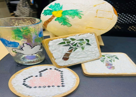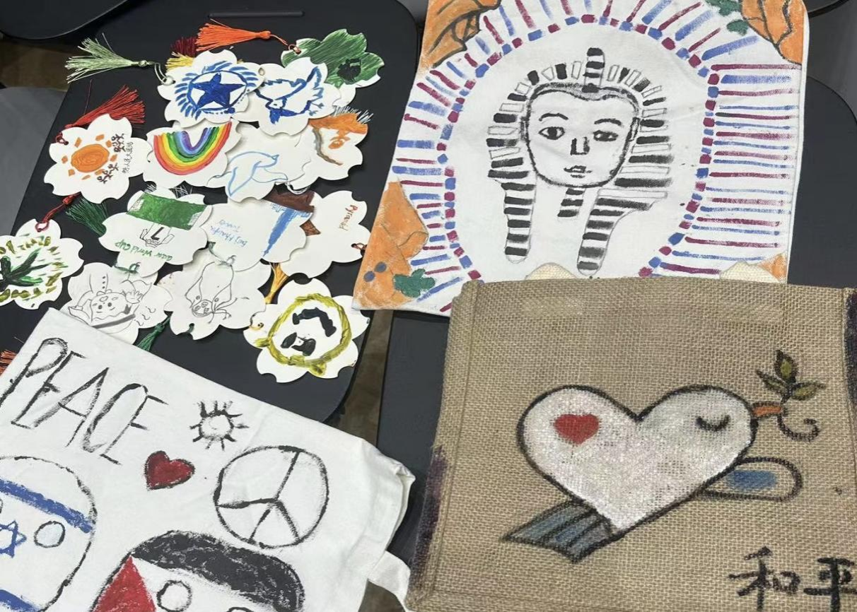 学员们以小组合作的形式开展交流,共同制作了精美的月球灯、独具匠心的DIY烤胶画、实用的玻璃杯、丰富多样的书签等。学员们用手中的画笔和各种颜料为工艺品增添独特的色彩,同时巧妙地将“和平鸽”“爱心”等图案融入创作之中。这些作品不仅仅是技艺的展示,更代表着学员们对世界和平的思考和对难民儿童的关爱之情。