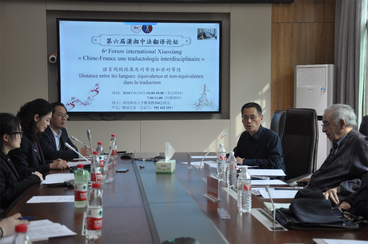 (通讯员 吴佳婷 曹雪)2024年11月1日下午,永利集团官网法语系主办的第六届“潇湘中法翻译论坛”顺利举行。本次论坛主题为“语言间的距离及对等性和非对等性”(Distance entre les langues : équivalence et non-équivalence dans la traduction)。论坛在永利集团3044欢迎光临腾龙楼204会议室与腾讯会议线上平台同步举行,永利集团3044欢迎光临法语系师生、法国国立东方语言文化学院、法国阿尔图瓦大学、北京大学、深圳出版社胡小跃出版工作室的专家学者以及国内外其他院校的师生共200余人参加会议。