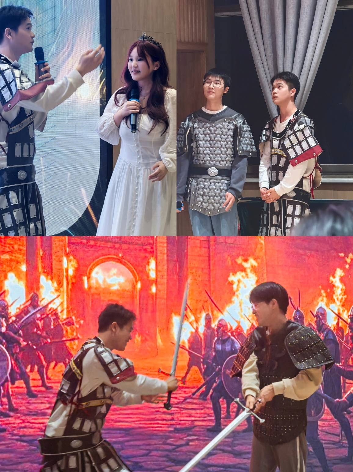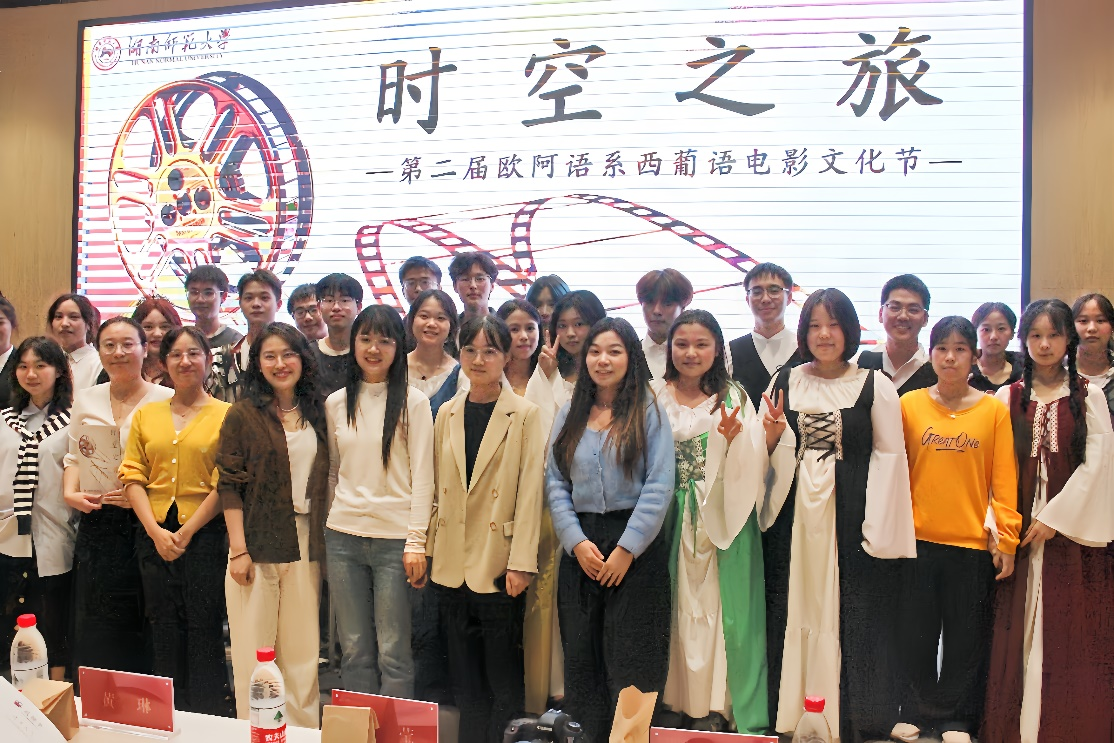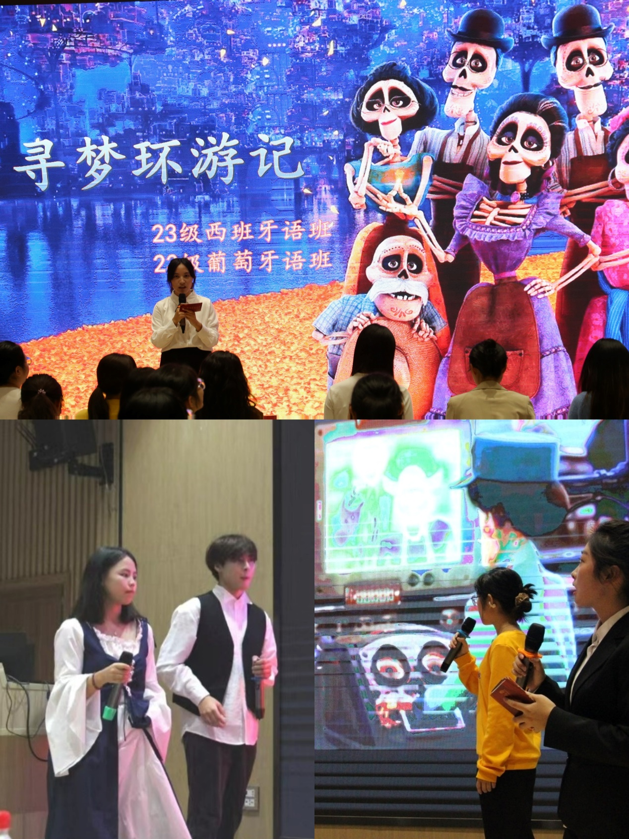 西葡语专业全体师生、2024级新生代表参加了本次电影文化节开幕式和首场观影活动。活动以“时空之旅”为主题,用多种节目形式展现了不同时期、不同地域中西语和葡语文化的社会风貌、历史文化和人文情感。23级葡语学生身着传统服饰表演了热情的葡萄牙土风舞,22级葡语班合唱悠扬清新的葡语歌曲,22级西语班用中西双语演绎了历史剧《特洛伊木马》。本次开幕式的特别节目是西语班与葡语班同学共同合作出演的《寻梦环游记》配音节目,是首次跨专业完成的合作演出。学生们不仅展现了不同文化的独特魅力,更通过精湛的演技和深情的表达,将观众带入了一个个生动的故事世界,游览多样的时空与文化之旅。