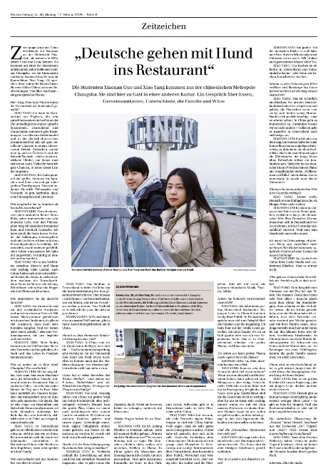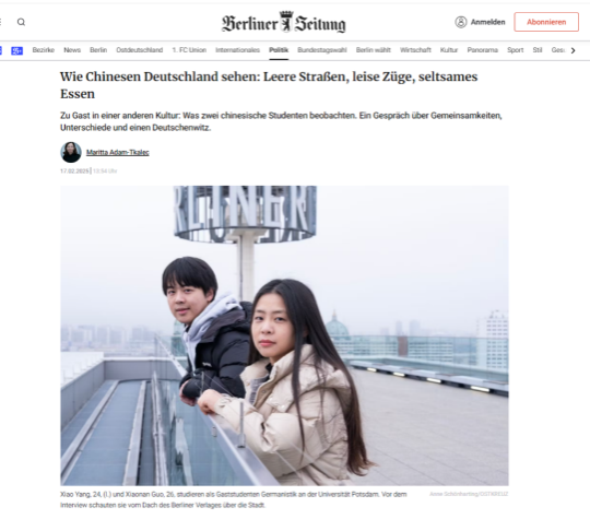 (通讯员:杨潇 孙兰香)2025年2月17日,德国《柏林报》刊登了对永利集团官网德语专业研究生杨潇、郭晓楠的专访,标题为:“德国人和宠物一起去餐厅吃饭”。《柏林报》网页版同时以“中国人如何看待德国:空旷的街道、安静的火车、奇怪的食物”为题发表了专访内容。