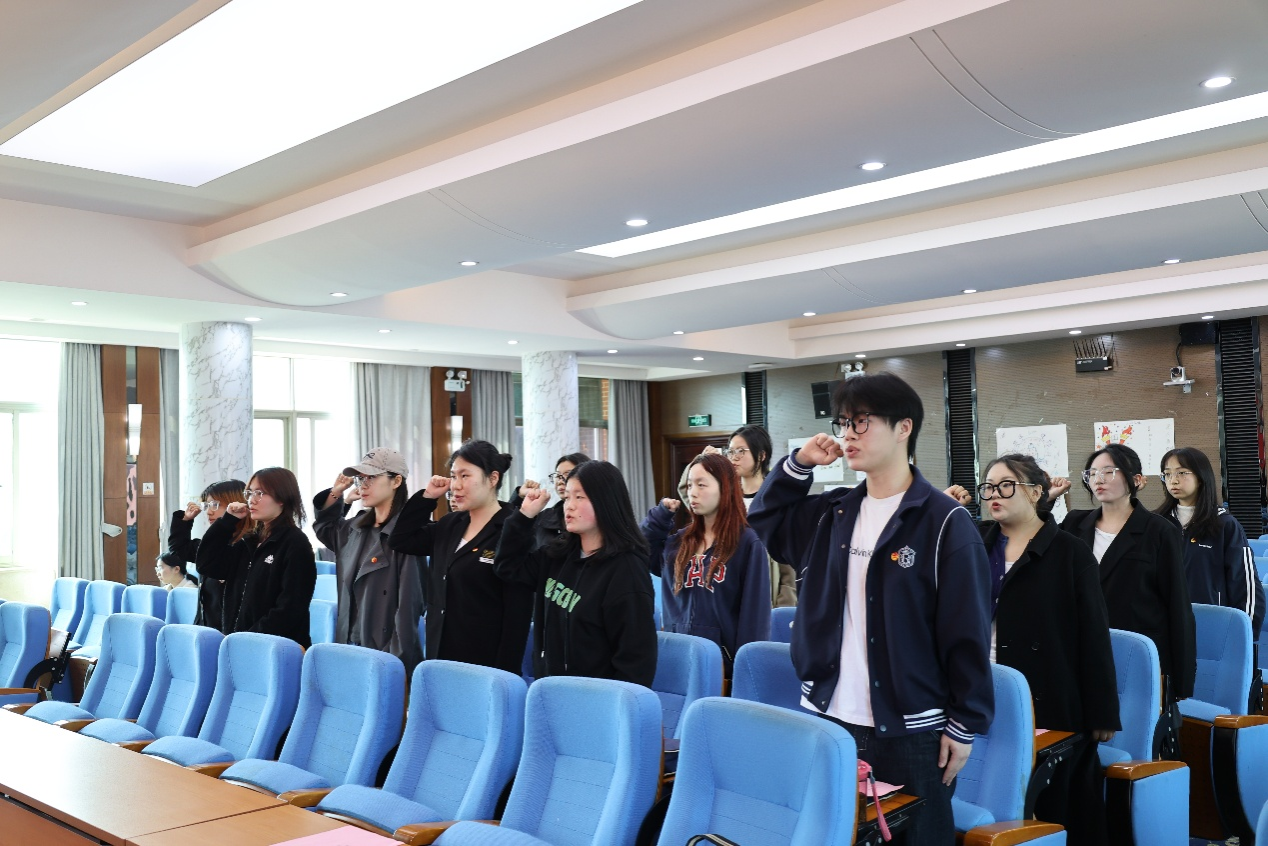 戴霁斌为新团员颁发团员证并佩戴团徽。新团员面朝团旗,在任奕然的带领下进行入团宣誓,表达成为一名光荣的共青团员的愿望和决心。