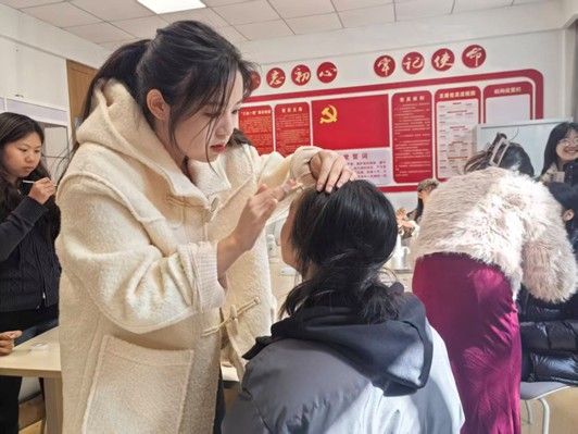 活动筹备阶段,化妆小组提前完成化妆品收集与分类整理、场地布置与划分等准备工作,在教室规划出有序的对接与化妆区域。活动开始后,参与者依次与化妆小组成员对接,小组根据每位同学的五官特征、风格偏好,定制差异化妆容方案,既贴合日常场景需求,又保留个人气质特点,助力参与者展现个性魅力。活动尾声,化妆小组协助完成场地整理、物品归位。
