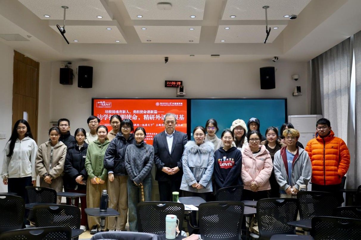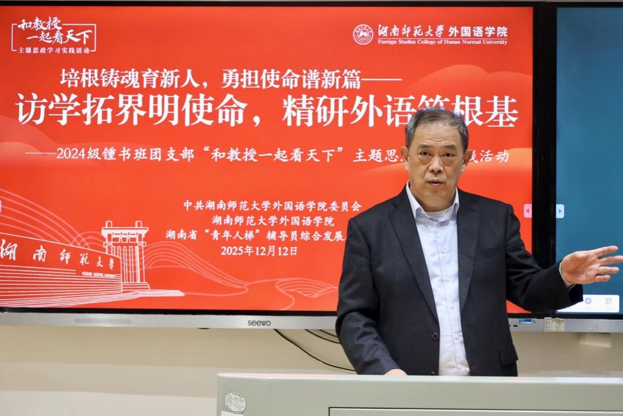 (通讯员 王蕾西 苏星璨)为深入学习贯彻党的二十届四中全会精神,全面落实立德树人根本任务,12月12日上午,永利集团官网2024级锺书班团支部于腾龙楼304教室开展 “和教授一起看天下”主题思政学习实践活动。此次活动以“培根铸魂育新人,勇担使命谱新篇——访学拓界明使命,精研外语筑根基”为主题,特邀中央电视台特约评论员,中国国际问题研究院美国研究所所长兼军控与国际安全研究中心主任,我校外交研究中心主任滕建群担任主讲人。
