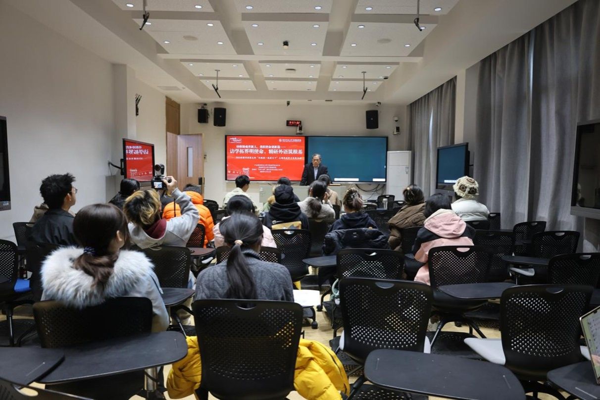 滕建群围绕“外语学习”与“国内外形势”两大主题展开分享讲授。在谈及外语学习时,他强调了语言能力对促进对外交流、深化国际理解的重要作用,并向学生提出四点具体建议:一是真正掌握外语,做到“刻入式”学习;二是拓展跨学科阅读视野;三是注重跨领域知识融合;四是主动关注前沿技术发展。他鼓励学生积极争取对外交流机会,以开放包容的心态,建立既有家国情怀、又具全球视野的思维方式。