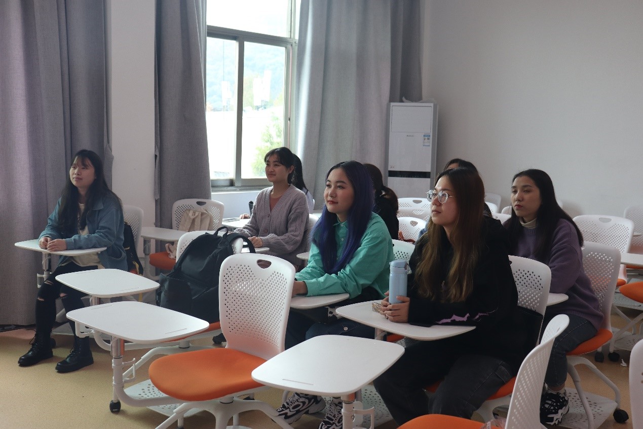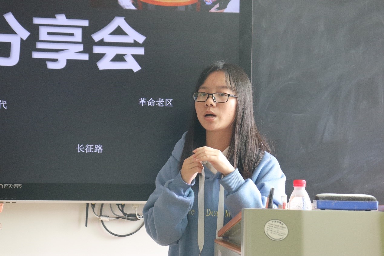 放映结束后,小组成员依次上台分享“我身边的红色故事”。袁晓杰、唐倩格、余凤英、杨思琪分别讲述了祖父跋涉千里见毛主席,曾祖父当兵保家卫国,初中教师扶贫,政府送物资的故事。来自红色土地江西的叶长莲分享了家乡“一口井”的故事。同时,她表示在国家政策的支持和驻村干部的帮助下,家乡发生了翻天覆地的变化,村民生活水平得到了极大的提高。扶贫干部扎根基层、为民谋发展的表率作用坚定了她努力学习、回报家乡的信念。