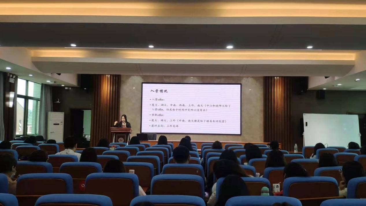 刘白肯定了刘若琪和朱汁彬的发言,并根据同学们存在的问题提出了三点建议:一是要对自身精准定位,分析自己的兴趣和特长。二是精准施力,确定目标院校和专业后不要轻易变动。三是做好两手准备,读研并非人生的终极目标,若保研或考研不如意,就业也是较好的选择。