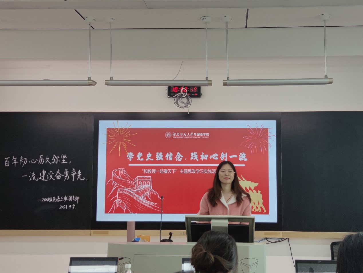 (通讯员 王如祺)为进一步深化对党的认知,深入学习党史,4月9日,永利集团官网2018级英语三班于腾龙楼501教室举办“和教授一起看天下”主题思政学习实践活动。永利集团官网教授郑燕虹出席活动,活动由团支书唐依琳主持,2018级英语三班全体同学参加。