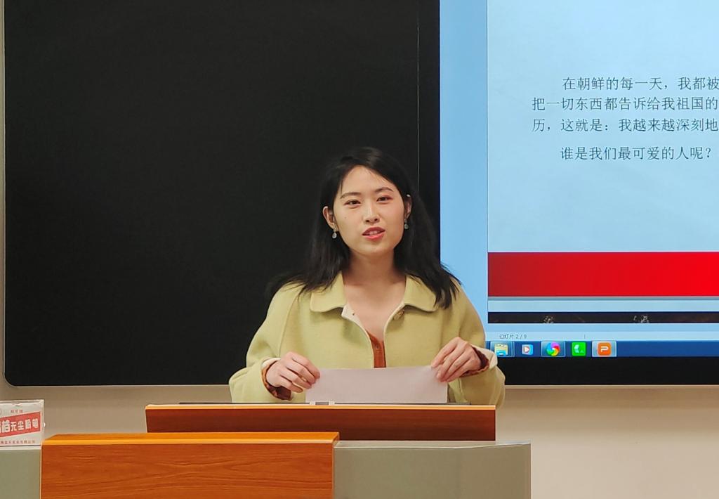 会议最后,邢鸿儒结合同学们的观点对此次活动进行点评,并讲述了抗美援朝时期的革命历史及英雄事迹。她认为,革命先烈们用鲜血与生命铸就了如今的幸福生活,后辈应当铭记党恩、缅怀先烈。她重点指出,共产党员要坚持党性和先进性,坚持党性就是坚持马克思主义、坚信共产主义理想、坚持共产党人的初心和使命。作为中国特色社会主义建设、中华民族伟大复兴重任的接班人,共产党员必须向党组织靠拢,像当时的革命先烈一样,勇为党的事业的先行者,在思想和行动上发挥先导、先锋作用。