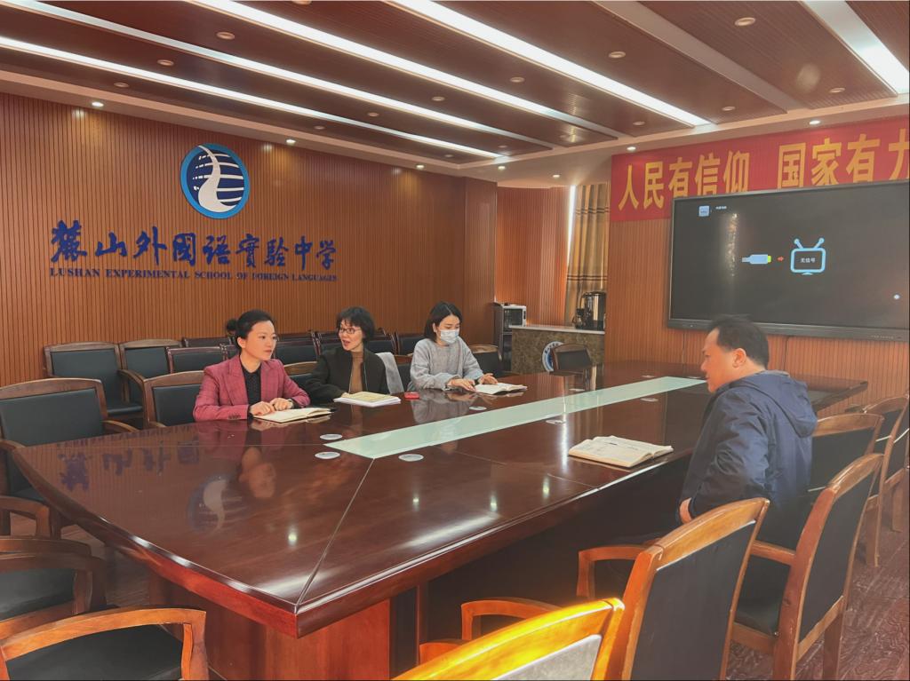 视察伊始,刘白一行受邀参加实习工作座谈会,麓山外国语实验学校副校长张廷华、教务处主任邓莉娜出席会议。会上,张廷华对2018级英语实习队进行了充分肯定。他表示,英语实习队自进校以来一直表现优异,得到了各年级、各位指导老师的充分肯定。同时,他对接下来的实习生教学任务提出了要求。他指出,实习生应当充分完善教学计划,结合先进的教学工具与实时的热点话题对学生进行培养拔高,应当充分立足世界一流学科建设平台,充分利用资源丰富课程内容,给学生带来有意义、难忘的课堂。