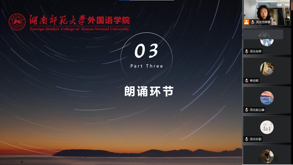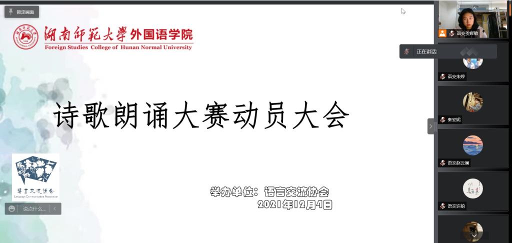 (通讯员 秦安妮 贺辉敏)12月4日晚,永利集团3044欢迎光临语言交流协会通过腾讯会议线上举办诗歌朗诵大赛动员大会。商学院朗诵协会理事长邹钰莹出席此次大会;会议由语言交流协会理事贺辉敏主持,永利集团3044欢迎光临部分本科生参加此次会议。