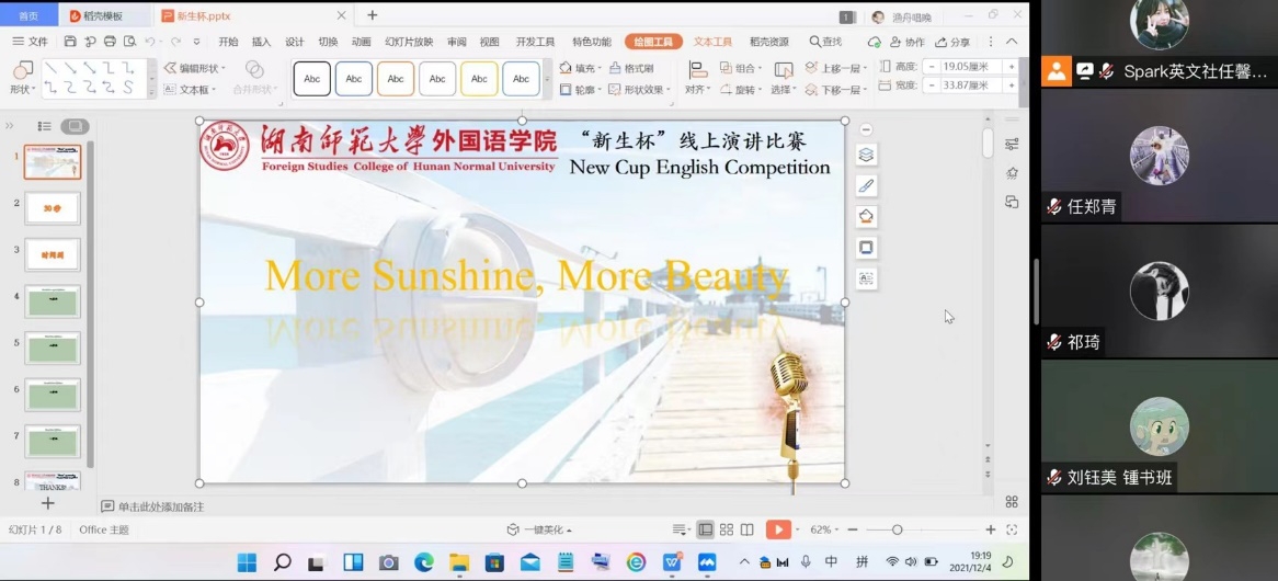 (通讯员 吕金 林杏)为激发永利集团官网2021级新生的英语学习热情,营造浓郁的校园英语学术文化氛围并促进永利集团官网英语学科素质教育的发展,Spark英文社于2021年12月4日晚在腾讯会议上举办以“More Sunshine, More Beauty”为主题的英文演讲比赛。此次比赛中,本科2020级翻译班陈诚同学和2021级6班刘斯佳同学担任主持人,部分会员和2021级本科生作为观众。