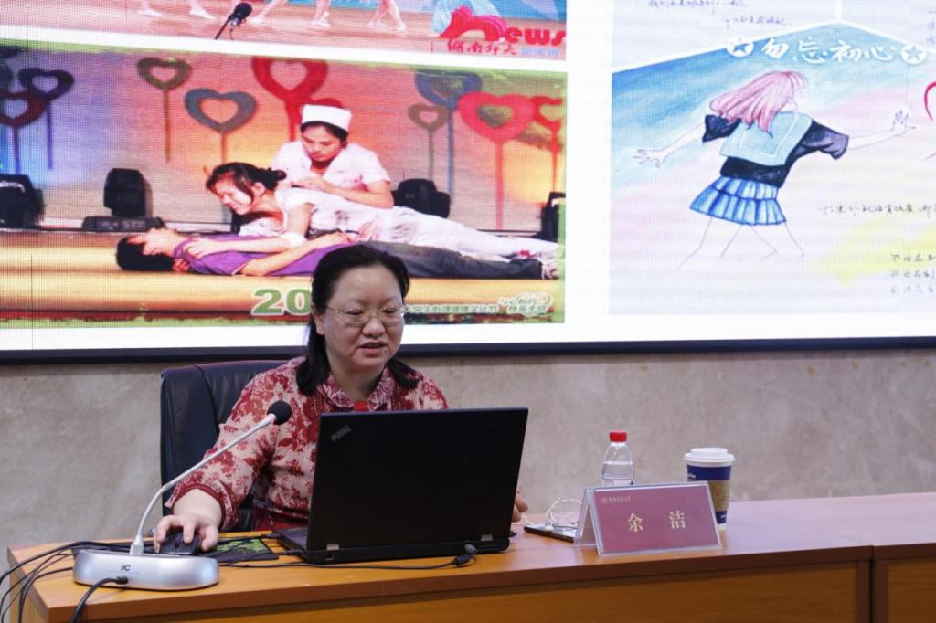 余洁向同学们简单介绍了我校学生工作部心理健康与教育咨询中心的基本情况、发展历程以及取得的成就。她还围绕“心手相牵,疫路同行”这一主题,以学校历年举办的团体心理辅导活动为例,对团体心理辅导活动做了全面详细的讲解,指导同学们如何开展团体心理辅导活动,并呼吁同学们积极组织、参与团体心理辅导活动。在讲解团体心理辅导活动的过程中,她说明了团体心理辅导活动和其他类型的心理辅导活动的不同之处,强调了团体心理辅导活动的特点和优势。
